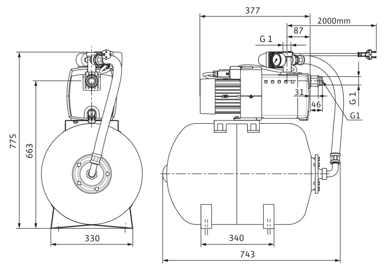 - Automatyczna praca instalacji z wykluczeniem uderzeń hydraulicznych dzięki zastosowaniu przełączników ciśnienia i ciśnieniowego naczynia przeponowego,