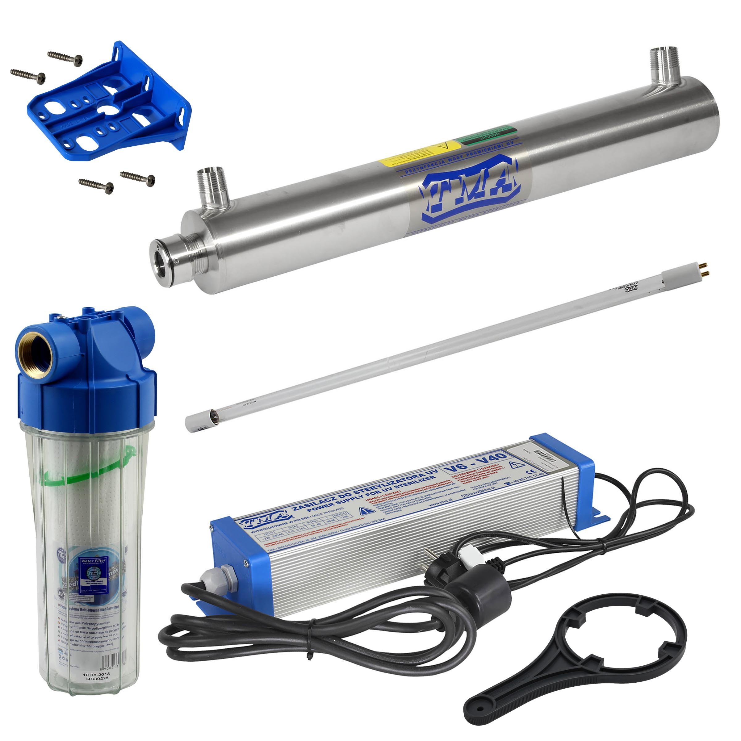 - Kompletny zestaw: obudowa filtra 10" Przyłącze 3/4", klucz, filtr polipropylenowy, płytka montażowa