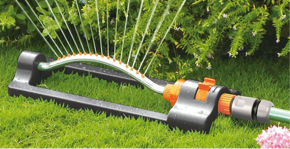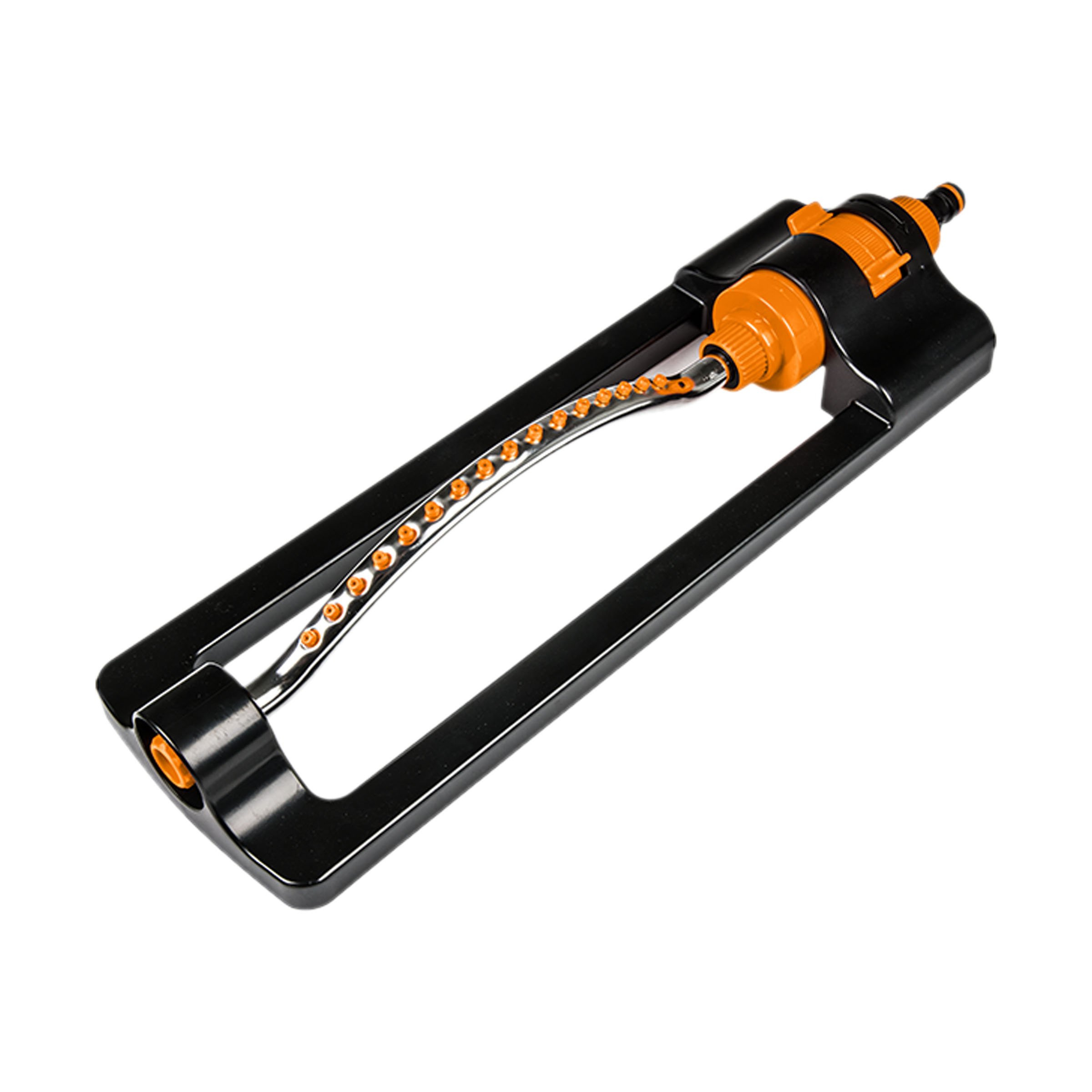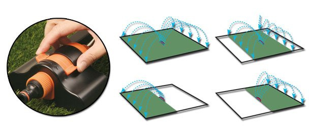 Zraszacz o konstrukcji wahadłowej z 16 dyszami, z ramieniem wykonanym z aluminium z regulacją zasięgu pozwalającej na zraszanie do 378 metrów kwadratowych powierzchni.
