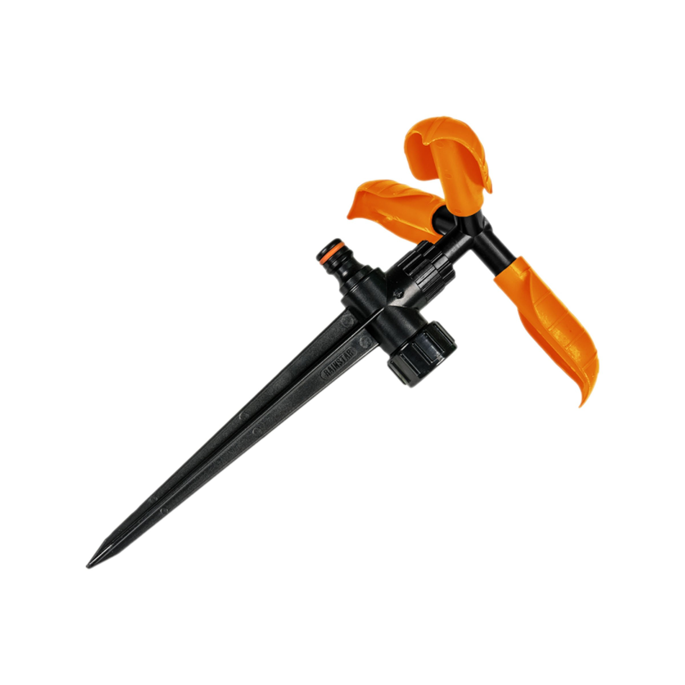 Zraszacz dwuramienny, obrotowy, regulowany, wbijany z trzema regulowanymi ramionami o pięciu otworach zraszających na każdym, wykonany z elastycznych materiałów chroniących urządzenie przed uszkodzeniami mechanicznymi.