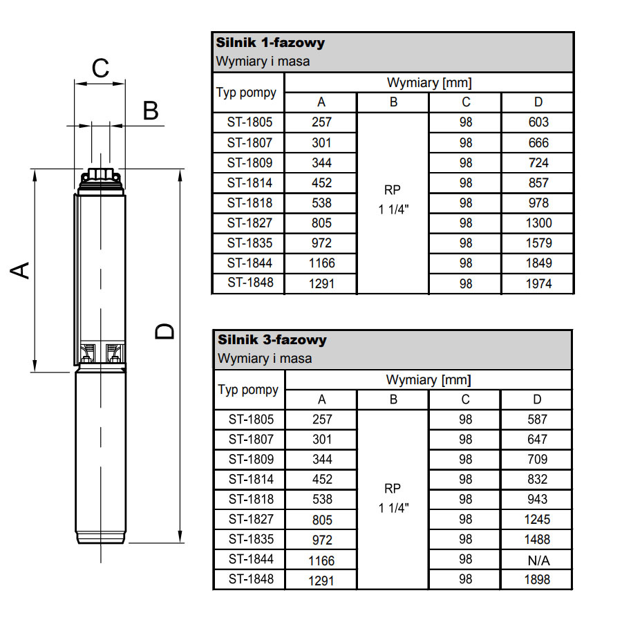 - Średnica pompy 4" (ok. 98mm ze śrubami i mocowaniem kabla)