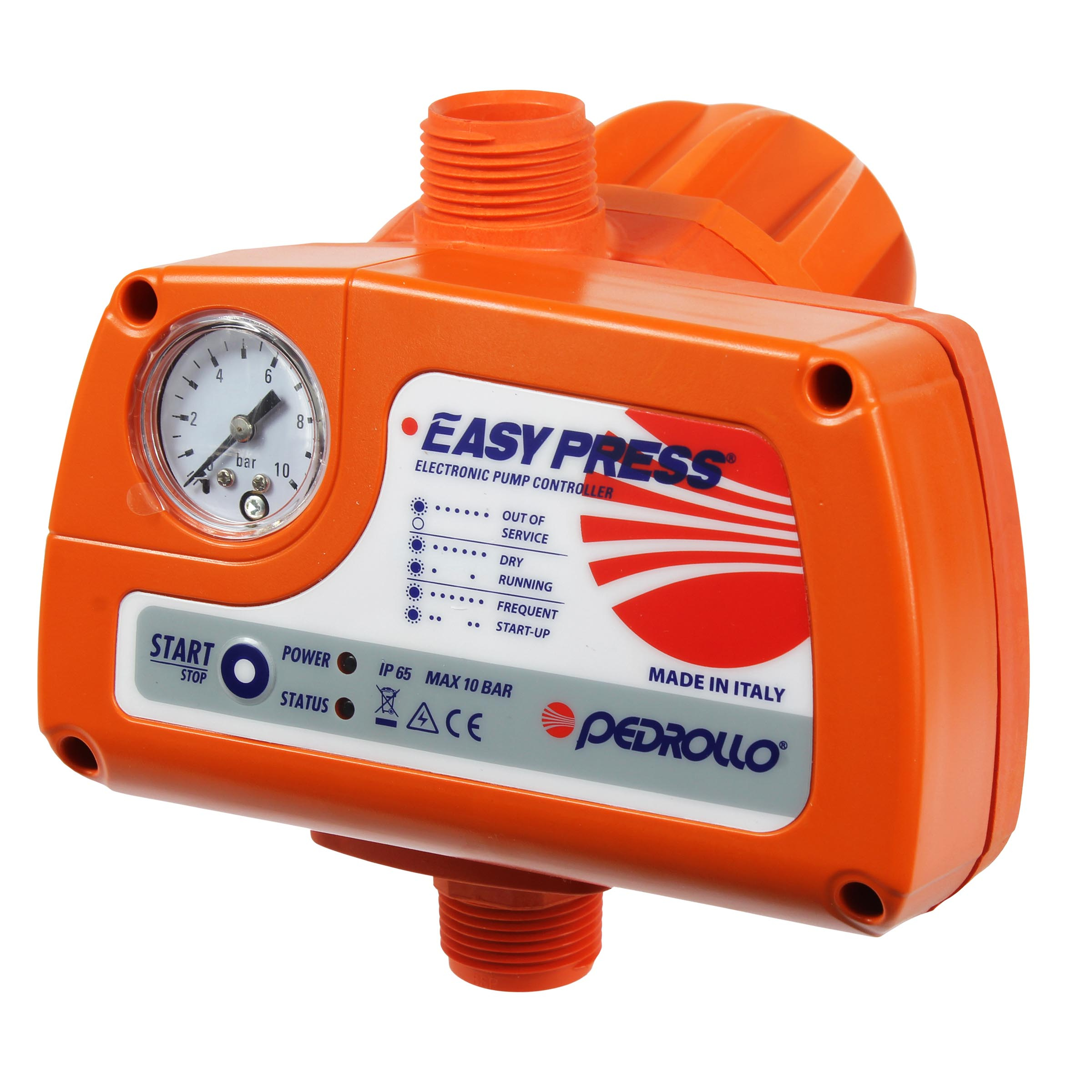 Easy press to zaawansowany sterownik do pomp jednofazowych, z manometrem do mierzenia ciśnienia. Posiada wbudowaną membraną ze sprężyną, która imituje pracę zbiornika hydroforowego oraz redukuje uderzenia hydrauliczne. To kolejna zaleta, gdyż do pracy układu z pompą nie jest potrzebny dodatkowy zbiornik. Easy press chroni także pompę przed suchobiegiem i umożliwia ponowne uruchomienie pompy ręcznie lub automatycznie. Kolejny atut wynika z faktu, że urządzenie jest bardzo pomocne gdy w instalacji występują pewne nieszczelności wówczas produkt zapobiega zbyt częstemu uruchamianiu się pompy.