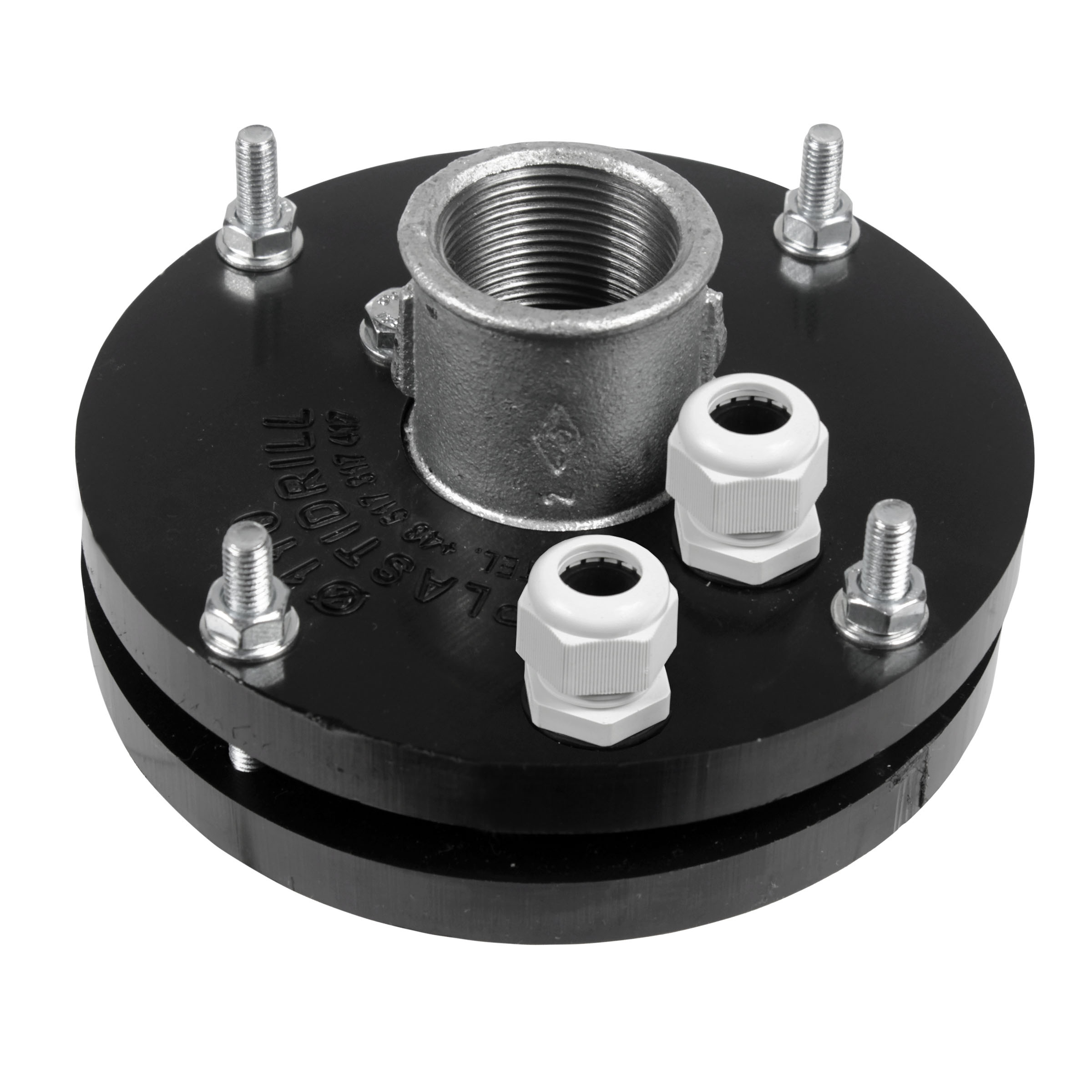 Głowica zbudowana jest z dwóch elementów wykonanych z tworzywa sztucznego, śrub do skręcenia obu tych elementów, uszczelki zapewniającej szczelność odwiertu, króćca ocynkowanego z gwintem zewnętrznym do montażu pompy, króćca z gwintem wewnętrznym do wyprowadzenia rury tłocznej na instalację, oczka do zamocowania linki zabezpieczającej pompę, dławików kabla elektrycznego po obu stronach pokrywy.