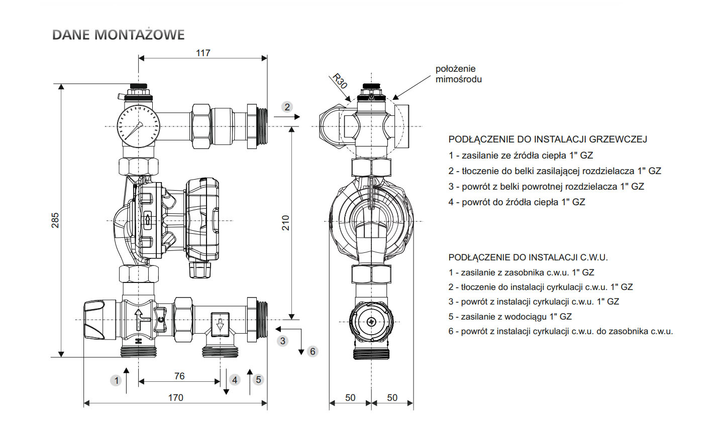- uniwersalność rozstawu – zastosowany mimośród 30 mm umożliwiający połączenie z rozdzielaczem o standardowym rozstawie 210 mm, a także innych rozdzielaczy o rozstawie od 180 mm do 240 mm