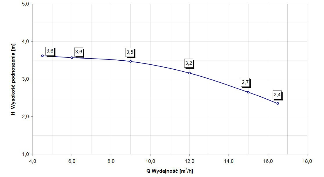 Wydajność max. [m³/h]:![]() Wydajność maksymalna Q max. - najwyższy możliwy przepływ cieczy przez pompę, przy najmniejszej możliwej wysokości podnoszenia H min. Aby właściwie dobrać pompę, należy wyznaczyć docelowy "punkt pracy" (wymagana wydajność i ciśnienie), uwzględniając wszystkie możliwe straty m.in. odległość pompowania, wysokość podnoszenia, przekroje rur itd. | 36 |