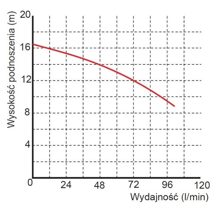 Wysokość podnoszenia max. [m]:![]() Wysokość podnoszenia H max. - najwyższa możliwa wysokość tłoczenia cieczy, przy najmniejszej możliwej wydajności Q min. Znając wysokość podnoszenia możemy w łatwy sposób określić maksymalne ciśnienie pompy. Wysokość podnoszenia 10m, to odpowiednik ok 1BAR ciśnienia. Gdy więc np. pompa ma max. 70m podnoszenia to w teorii powinna dać na wyjściu ok 7BAR. | 16,5 |