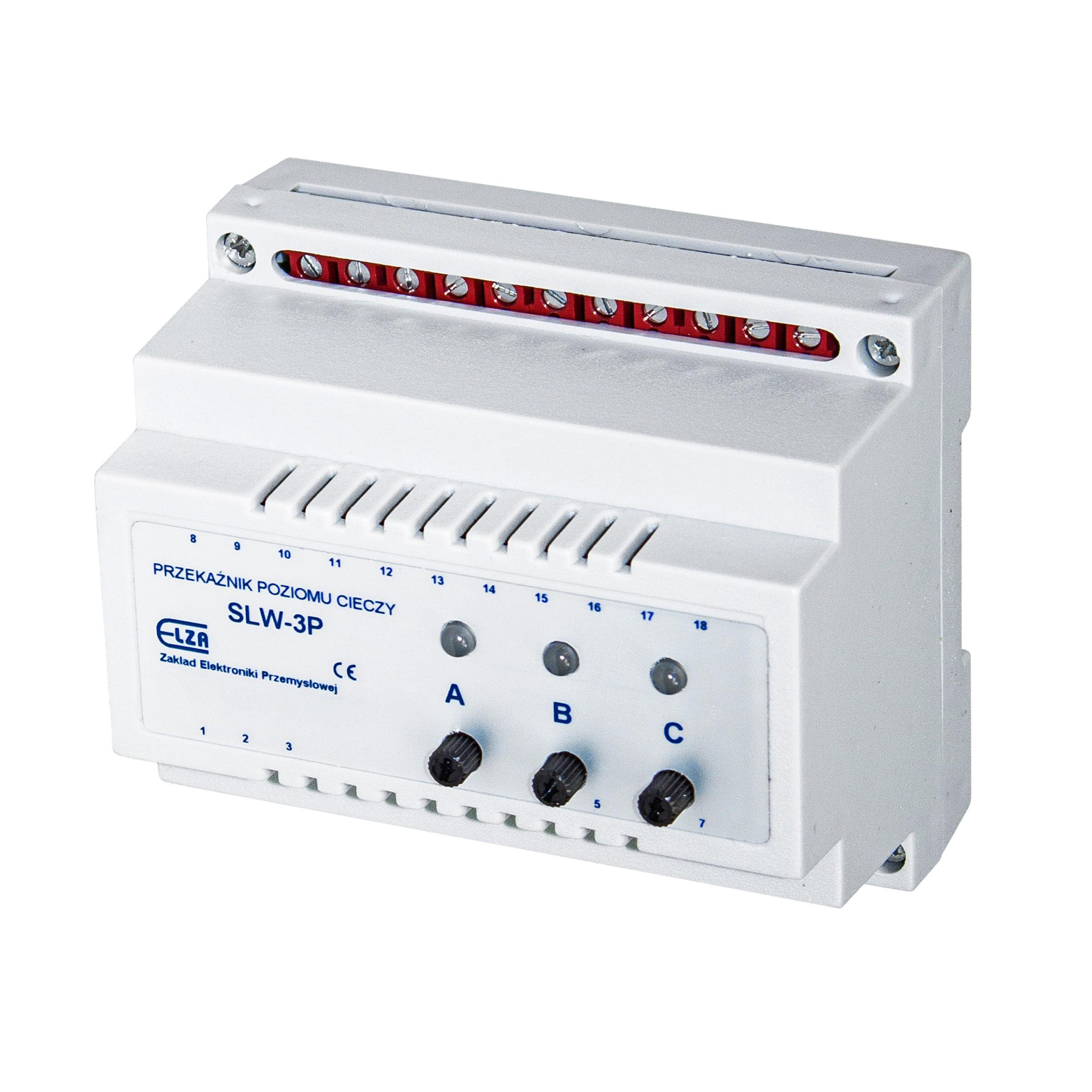Przekaźnik typu SLW-3P, podobnie jak SLW-2P znajduje się w obudowie przeznaczonej do montażu na "szynę" T35 (SLW-1 zabudowany jest w hermetycznej obudowie z tworzywa sztucznego). Na obudowie znajduje się pokrętło potencjometru nastawy czułości, lampka sygnalizacyjna oraz listwy zaciskowe. Elementem sterującym wyjściem są styki przełączne elektrycznie odseparowane od obwodów przekaźnika i mogą np. sterować bezpośrednio cewką stycznika układu zasilania pompy.